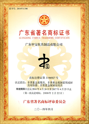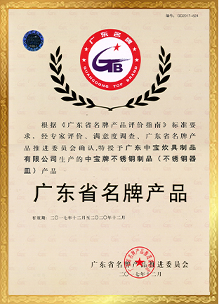 - 2014年12月,不鏽鋼器皿係列產(chǎn)品再次被廣東省質量技術監督局授(shòu)予“廣東省名(míng)牌產品”(2014-2017)