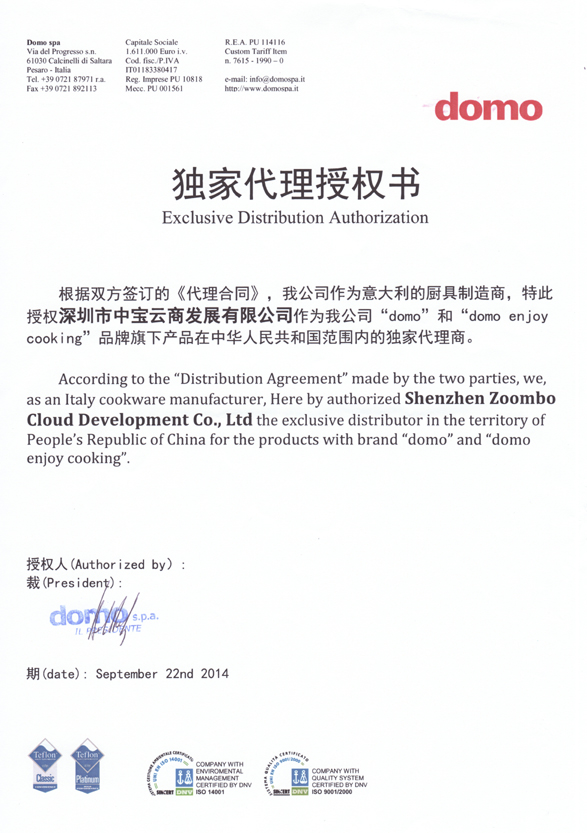 2014年9月,廣東草莓视频在线看污炊具製品有限公司全資(zī)子公司——深圳市(shì)草莓视频在线看污雲商發展有限公司,正式成為意大利知名廚具品牌“domo”、“domo enjoy cooking”的中國獨家代理商。